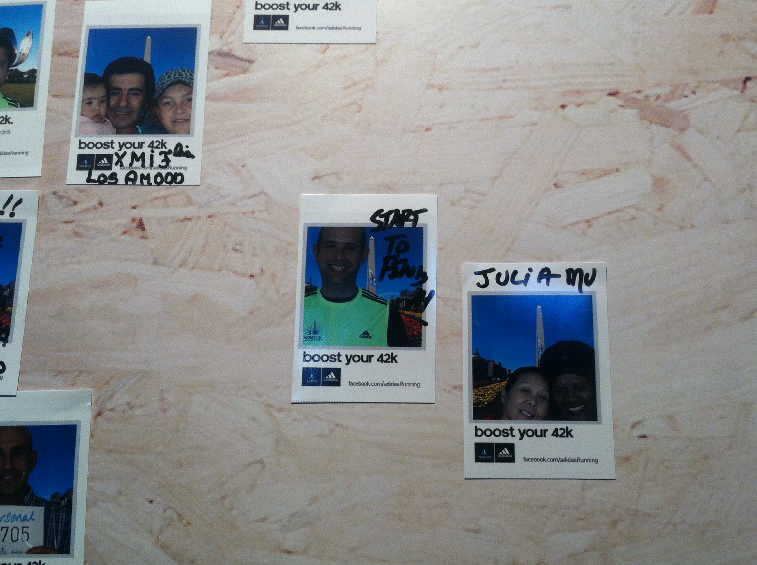 If you go to the Burger Joint on Jorge Luis Borges, sit at the booth opposite the “Que Ves?” mirror. Look up at the wall and with luck, you’ll see the following: 42K Start to Finish. Jerry and Mike, Buenos Aires, October 13, 2013.